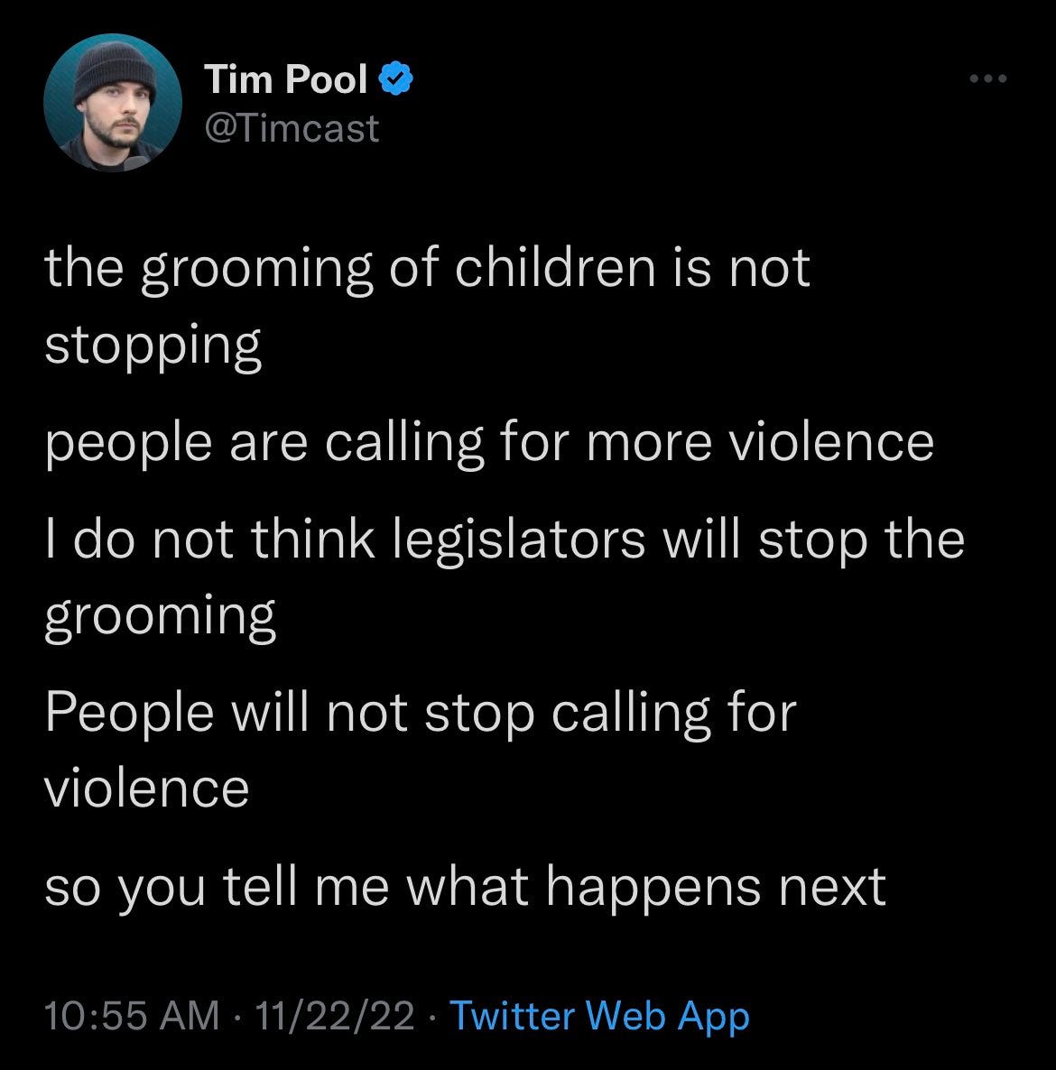 Do you need more examples? Tim Pool, a genuinely stupid person with 1.4 million Twitter followers, also went with the “stop hitting yourself” approach, claiming “we shouldn’t tolerate pedophiles grooming kids, Club Q had a grooming event,” [sic] and plenty worse, which is not worth the energy to put into context.